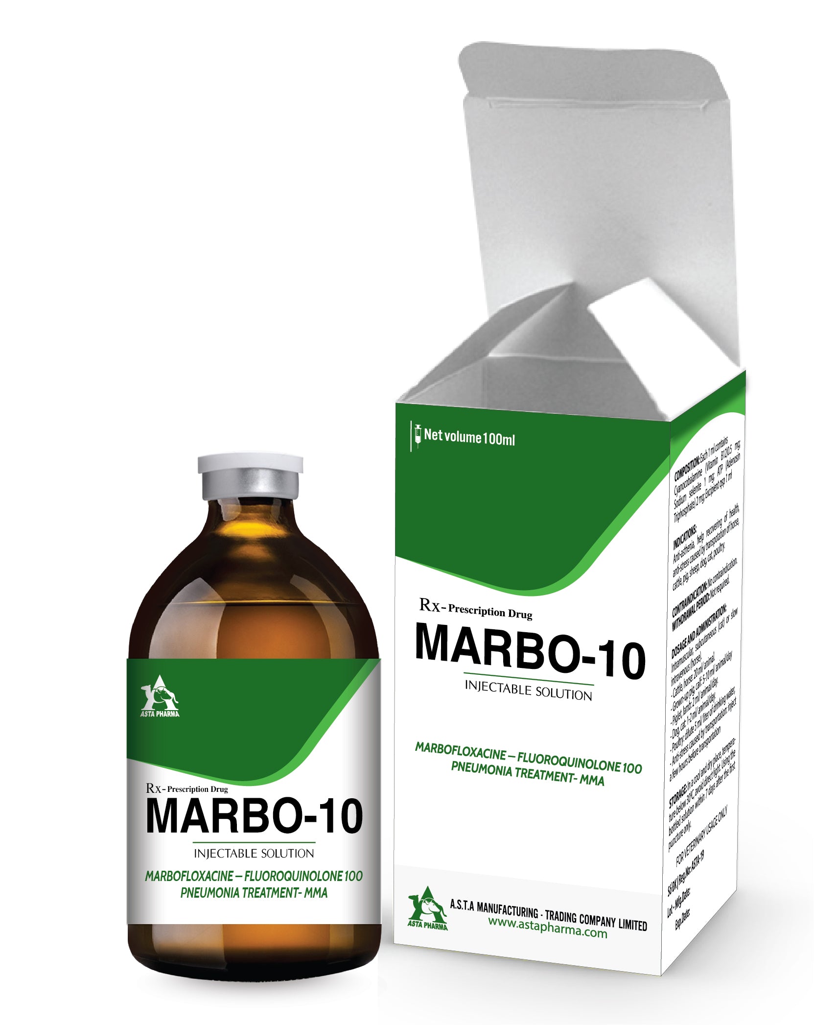 Treatment of respiratory tract diseases and acute mastitis caused by bacteria sensitive to Marbofloxacin.